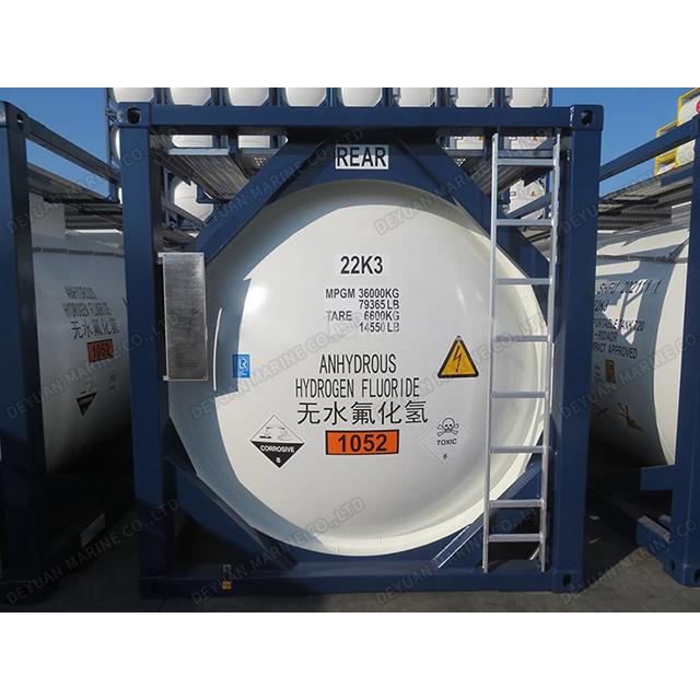 Anhydrous hydrogen fluoride can be stored inside steel container, and for effective transportation usually install the tank inside anISO standard frame, it is called AHF tank container.