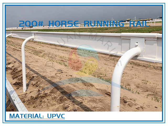 200# horse running rail, fence height: 1250 mm, spacing from post center to center: 2500 mm. The fence post is made of 63 mm high-strength carbon steel pipe with uniform diameter, fully hot-dip galvanized. The fence board adopts a 200 mm wide UPVC extruded profile, with good flexibility and high strength, can withstand high-intensity impact and rebound recovery. It has high safety and forms safety protection for riders and horses, and is a standard fence for large speed races held by equestrian clubs at home and abroad in recent years.