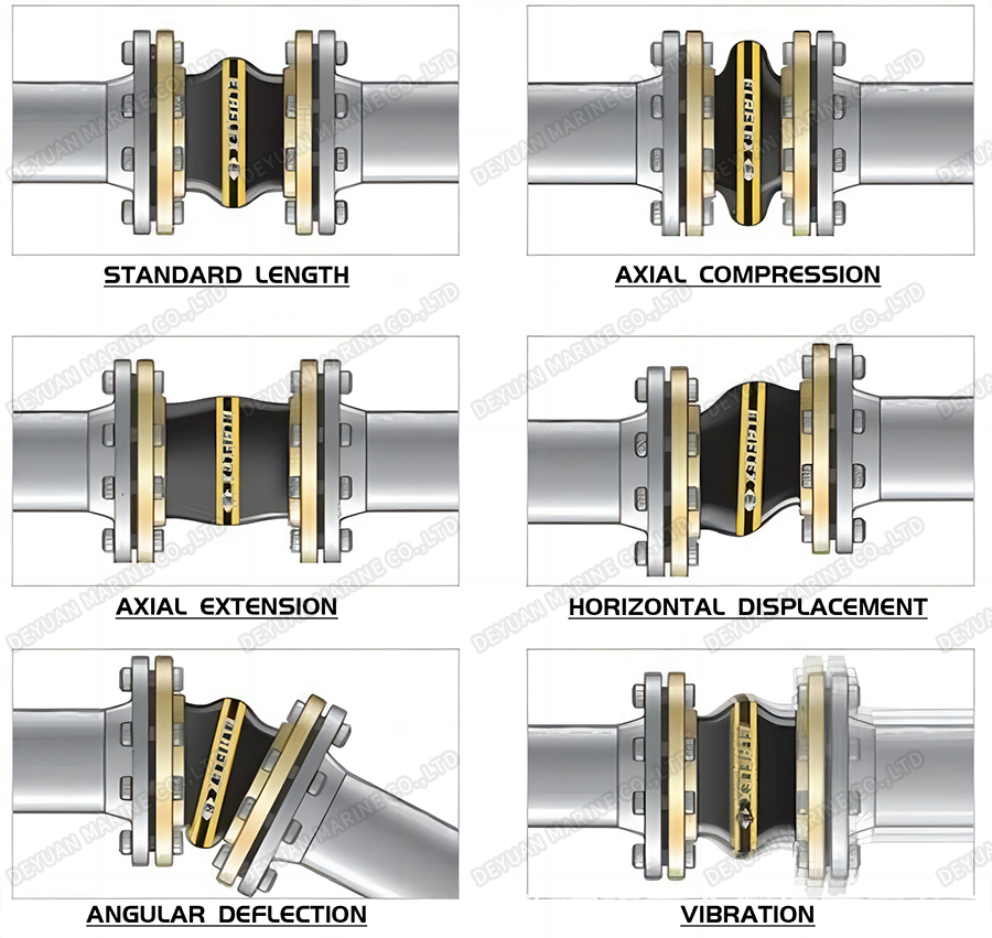 The Flexible Rubber Expansion Joint can be work at conditions of Axial Compression, Axial Extension, Horizontal Displacement, Angular Deflection and Vibration.