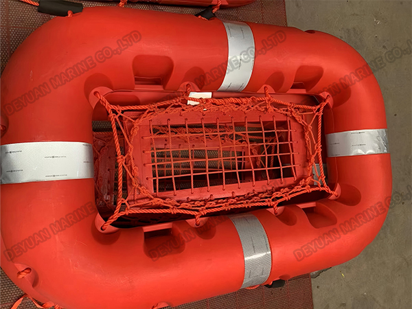 The main body features a red flotation structure with silver reflective strips on the surface to enhance nighttime visibility. A red mesh storage area is positioned at the center, designed to hold life jackets, first aid kits, and other rescue equipment.