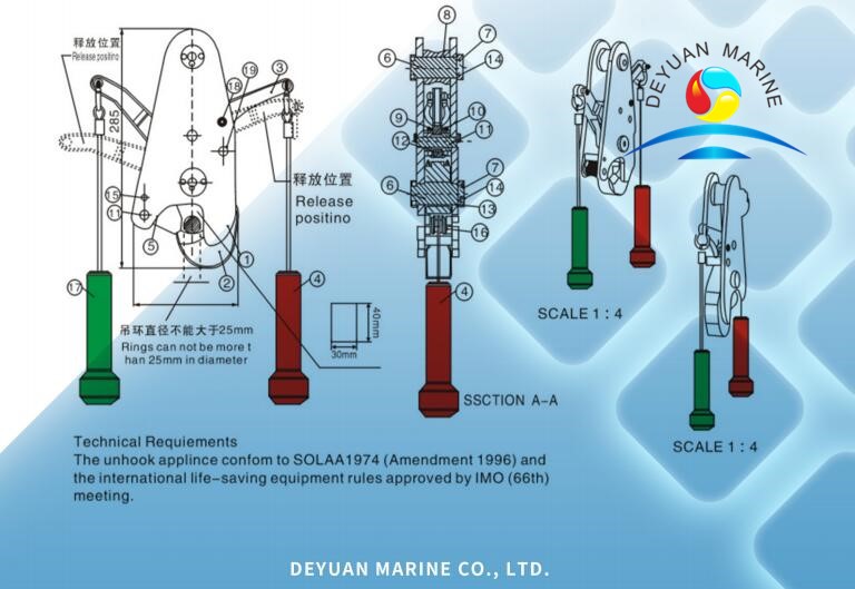 3.3 Under severe natural environment, the release hook would produce partial on-load which will influence the automotic release function. In case of emergency, pull the green handle for manual releasing.