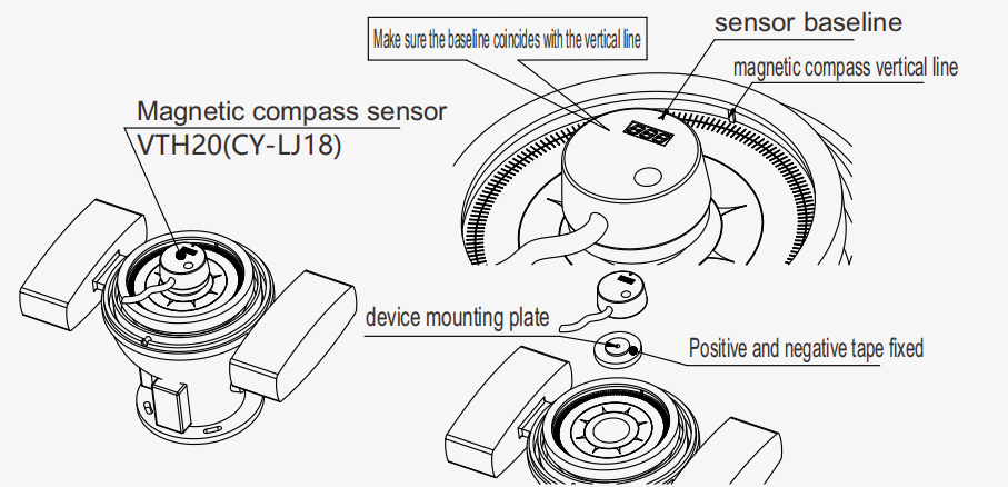 VTH20 is optional, installation method: the to the sending device with double-sided adhesive to it solid Set to the center of the magnetic compass, the head and tail magnetic lines of the magnetic compass and the transverse lines must be weighted toward the base of the transmitting device Together, connect the cable to the main control box of the steering gear. Specific installation method as shown below: