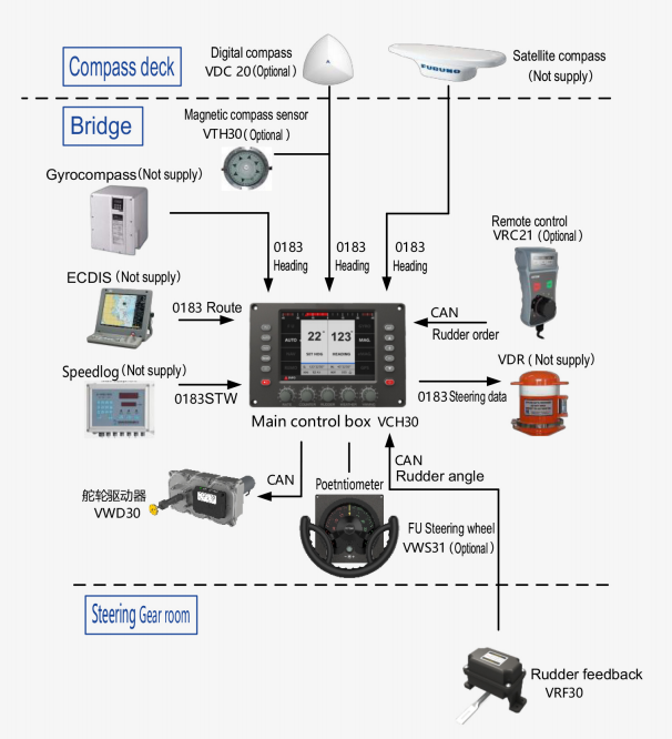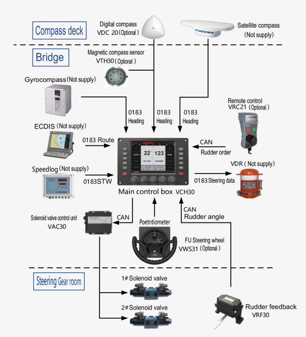 The system diagram describes the electric pump + machine with pump, solenoid valvetype rudder control. It has the manual steering, automatic steering, remote follow-up steering and other modes.