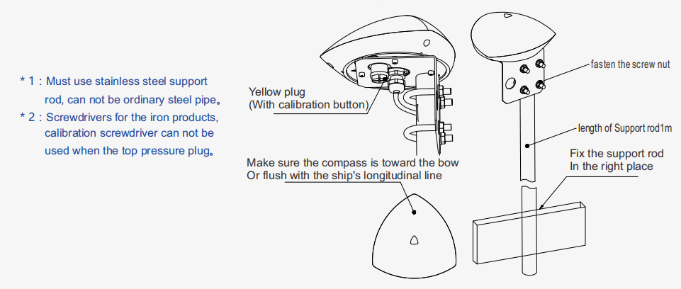 VDC20 digital compass should be installed in the middle of the railing deck railings, equipment is equipped with a Diameter 1 inch length of 1 meter stainless steel pipe that U-tube card and other accessories,the U-tube card will be fixed on the railing, And then the electronic compass sensor installed in the top of the stainless steel tube, the top of the housing has a heading markThe direction should be towards the bow, the sensor should be about 1.5 meters from the deck height, and then the random cable Line layout to the cab rudder stage, the sensor as far as possible away from the iron products, a safe distance of one meter about. Specific installation method as shown below.