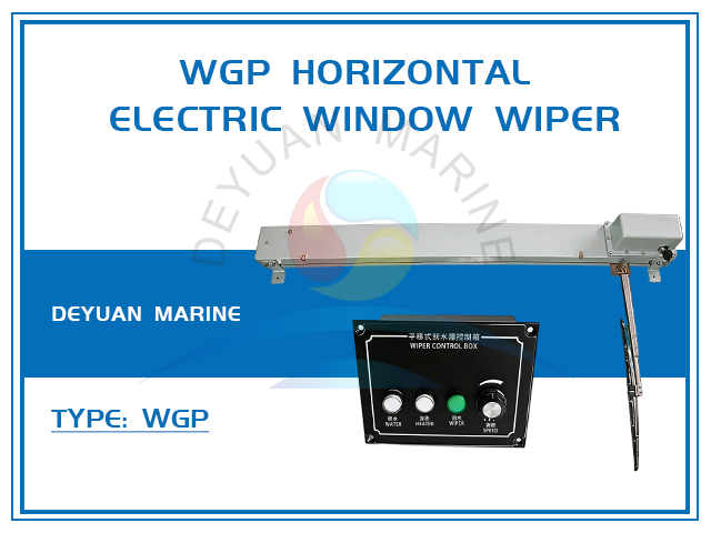 WGP type horizontal electric window wiper is a kind of electrical window wiper to be used for windows in wheelhouse or operating cab in a vessel.it has a speed-adjustable motor-driven power,rails are made of aluminum alloy,and it drives rubber wiper blade installed at bottom of stainless steel swing rod to wipe the glass horizontally through the transmission, and in order to maintain a clear vision in the ocean waves crashing, rain and snow and other environments. This product is appropriate for various vessels and civil vessels.