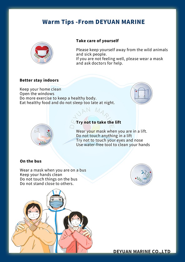 Dear customers,since the further outbreak of the novel coronavirus (COVID-19) worldwide, DEYUAN MARINE would like to remind you to take good care of yourself and your family,cause this virus can be passed on through people, it’s continuous person-to-person transmission.