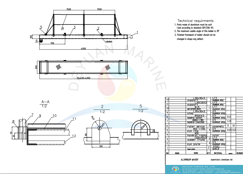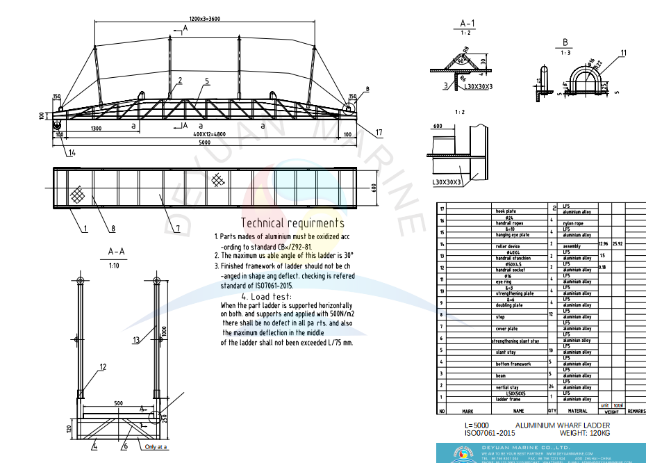 All aluminum parts shall undergo anodizing treatment. The gangway ladder shall be used at a maximum angle of 30 degrees, and the completed ladder shall not be skewed, twisted, or deformed. Strength test: The two ends of the ladder shall be supported, and after unloading with a load of 75Kg per two steps, there shall be no deformation.